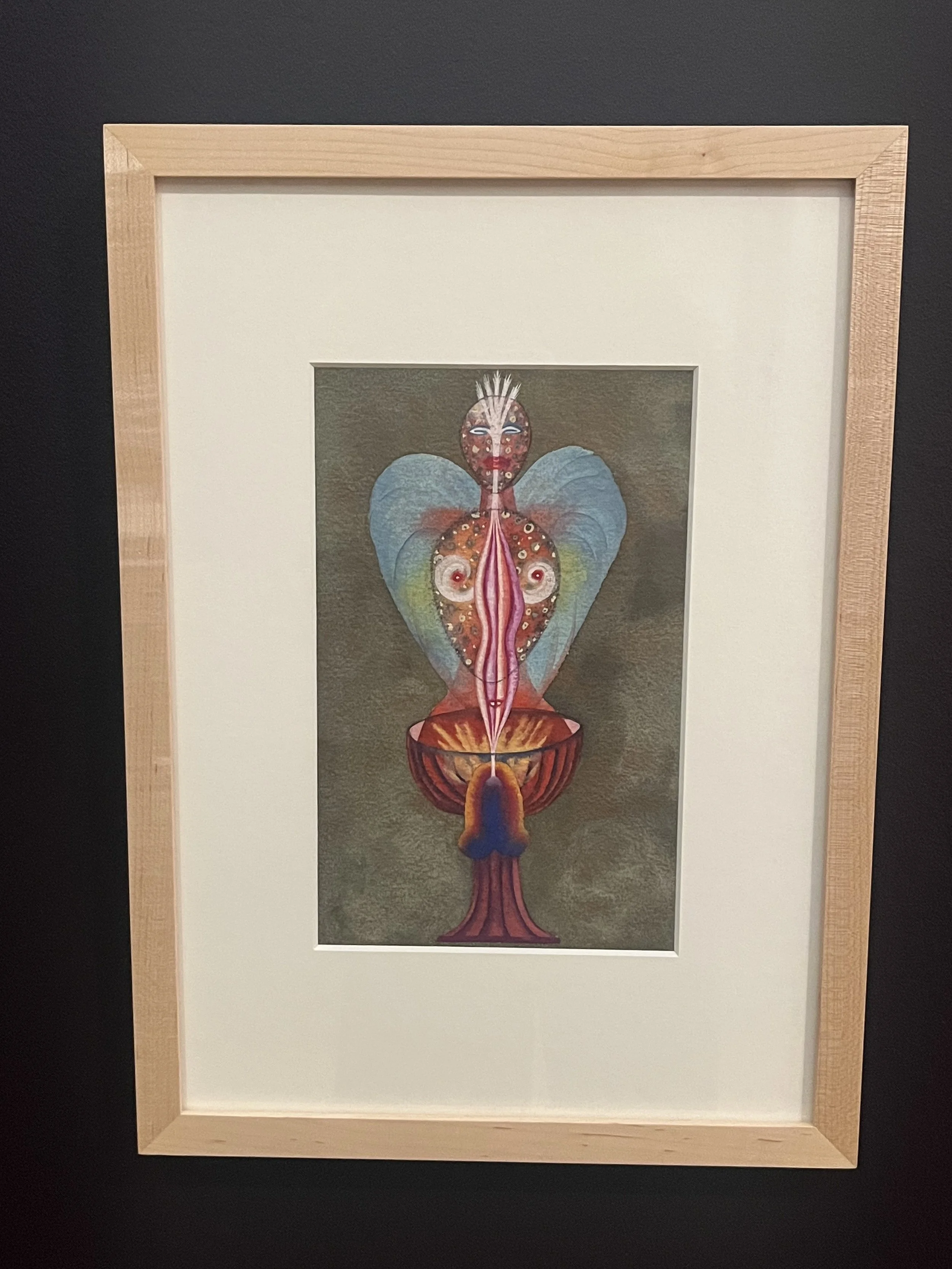 Colquhoun was born in India in 1906 but moved back to England at an early age. She saw herself as occupying a transitional spiritual space between Eastern and Western cultures. Growing up, Colquhoun was surrounded by colonial families who were seeking to reconnect with their English heritage. However, she spent a great deal of her time without the presence of her parents to guide her acclimation. This led her to research the spiritual customs of India, while also growing increasingly interested in how to depict the natural environment through a lens of esoteric philosophies. She was influenced by Eastern mysticism and religious practices such as Hinduism, Christian mysticism, Tantra, Tarot, and blended them with Celtic lore, Christian mysticism, and alchemy. In 1931 in Paris she encountered Surrealism for the first time, and enthusiastically engaged with the movement. She was invited to join the British Surrealists in 1939. However, she later broke away to forge her own path due to her refusal to relinquish her interest in the occult. In the 1950s, she became associated with the Ordo Templi Orientis and New Isis Lodge, and further involved herself throughout the 1960s with organisations such as the Druid Order and the Ancient Celtic Church, which led to her ordination as a Priestess of Isis by 1977. The piece above was part of her Diagrams of Love series 1940-42, in which she explored and reflected kabbalistic, tantric and alchemical ideas. The blue-winged androgynous figure emerges from a red chalice, the vulvic and phallic symbolisms present fusing energies: male and female, birth and death.