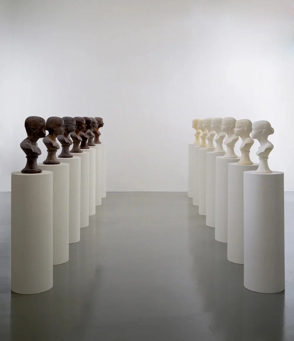 Janine Antoni, ‘Lick and Lather’, 1993. Seven licked chocolate self-portrait busts and seven washed soap self-portrait busts on fourteen pedestals, busts: 24 x 16 x 13 inches and pedestals: 45 x 16 inches.